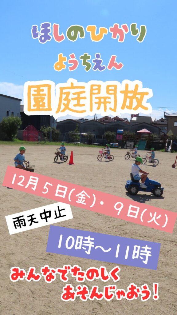 トップページお知らせ令和7年12月の園庭開放 2025-12-01 お知らせ 入園希望の皆様へ 令和7年12月の園庭開放 寒さが厳しくなる前に元気いっぱい星の光幼稚園の運動場であそんじゃおう! ぜひみなさま お越しくださいね 記事一覧 前の記事 >