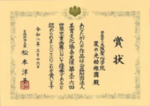 トップページお知らせ第56回世界児童画展 特別賞 三名受賞! 2026-03-27 お知らせ 第56回世界児童画展 特別賞 三名受賞! この度 栄えある世界児童画展におきまして 3名の作品が特別賞に輝き 団体賞【文部科学大臣賞】を頂戴いたしましたことを ご報告いたします 3月24日読売新聞朝刊河内版に 三人の喜びの声が掲載されました! 特選・入選作品も後日 作品紹介のページで公開予定です < 次の記事 記事一覧 前の記事 >